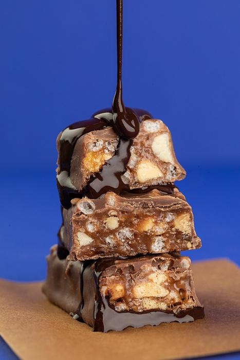 Внутри смесь из изюма, кукурузных шариков, арахиса и карамели. Всё это покрыто молочным шоколадом.